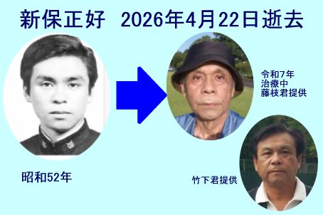 | 2026年4月22日(水)夕刻、闘病中のところ逝去されました。 54中隊陸上 有機化学 軟式庭球部 山形県立長井高等学校 ●喪主:新保茂子様(妻) ●連絡先(自宅): 〒285-0858 千葉県佐倉市ユーカリが丘7-24-1-206壱番館 ●葬儀(1日葬):2026年4月30日(木)11:00〜12:30 ●葬儀場所:博全社ウィズモア佐倉 (千葉県佐倉市海隣寺町13-6) TEL:0120-444-999B by21期生会陸理事 平野治征 |