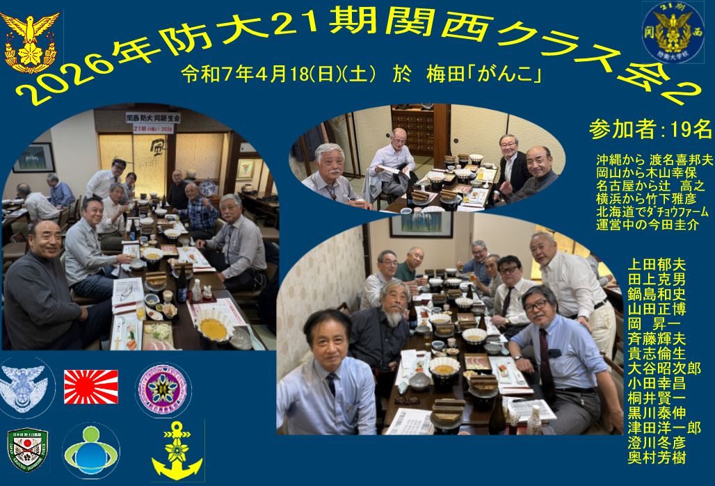 2026年度防衛大学校21期関西同窓会 俗称:生存確認会 平成8年(2026)4月18日(土) 19名参加 於 「がんこ梅田本店」 |